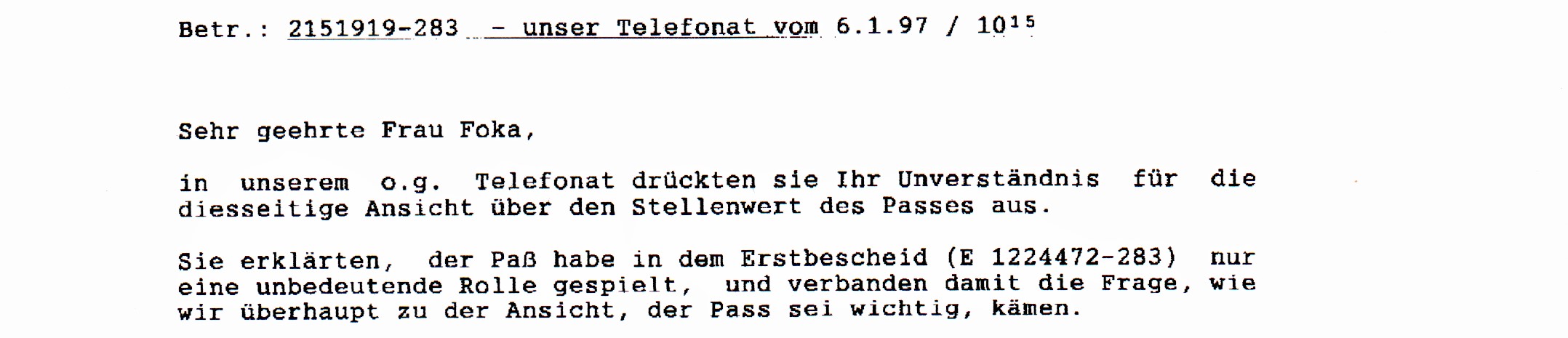 Sie hatte mich bei diesem Telefongespräch doch tatsächlich gefragt, wie ich denn überhaupt auf die Idee gekommen wäre, dass der Paß wichtig sei. |