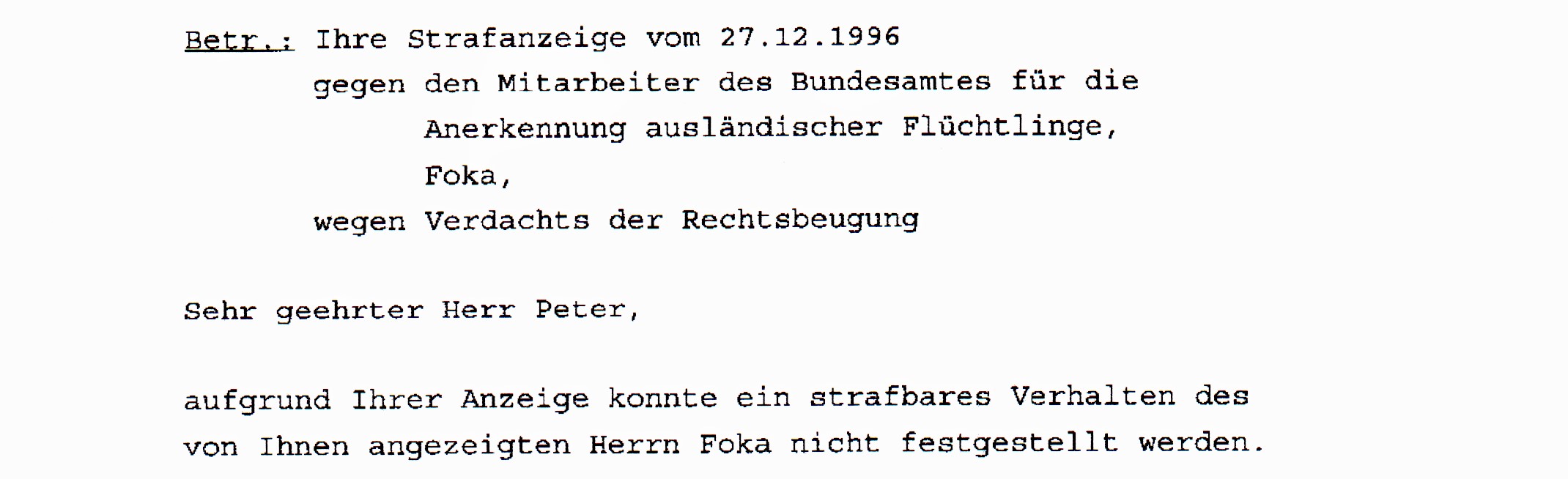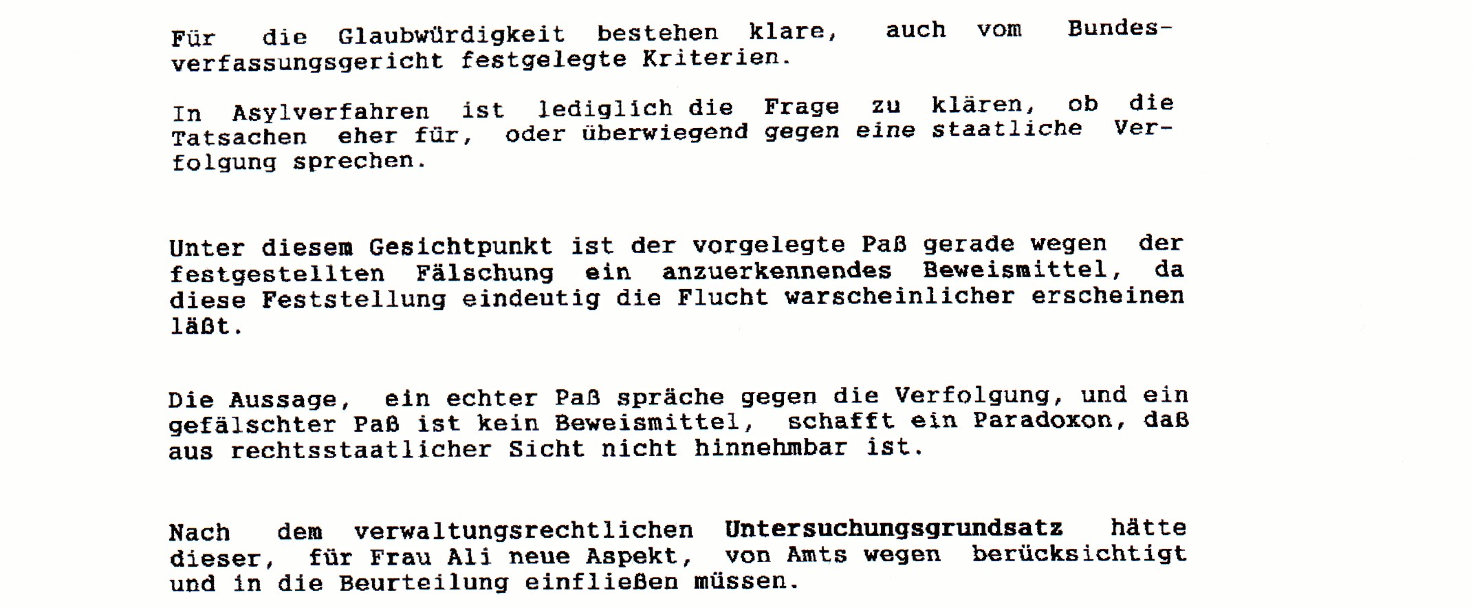 Wie nützlich ist ein Untersuchungsgrundsatz, wenn unbeantwortbare Fragen gestellt werden, willkürliche Behauptungen aufgestellt werden, und allgemeine Lebenserfahrung und einfachste Logik unbeachtet bleiben? Nicht eine der von mir im Zuge der Vorbereitung befragten Personen kam auch nur annähernd zu ähnlichen Schlußfolgerungen wie Bundesamt, Verwaltungsgericht oder Staatsanwaltschaft. Selbst eine kritische Einstellung zum Asylrecht und insbesondere zur vorliegenden Verfolgungs-geschichte kann die bisherigen Ergebnisse nicht rechtfertigen, so dass man nur zu der Annahme kommen kann, dass hier bewusst alles vermieden wurde ein für die Antragstellerin positives Ergebnis zu erreichen.Eine bewusste Verletzung des Untersuchungsgrundsatzes könnte strafrechtliche Konsequenzen auslösen, so dass eine entsprechende Überprüfung angeraten war. Aber auch hier führte die angestrebte strafrechtliche Untersuchung zu keinem Ergebnis. |